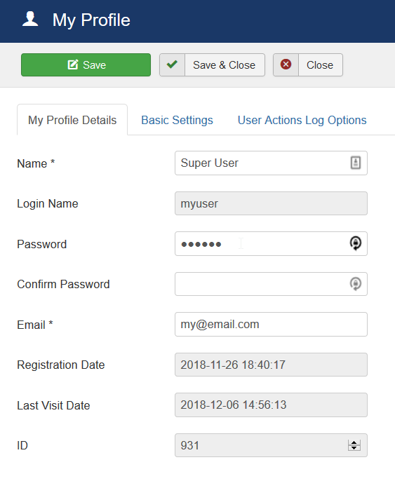 - Click Save to save the new password and continue making edits, or Save & Close to save the new password, and close the screen